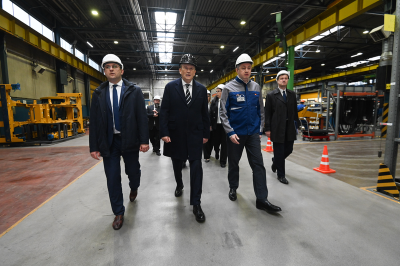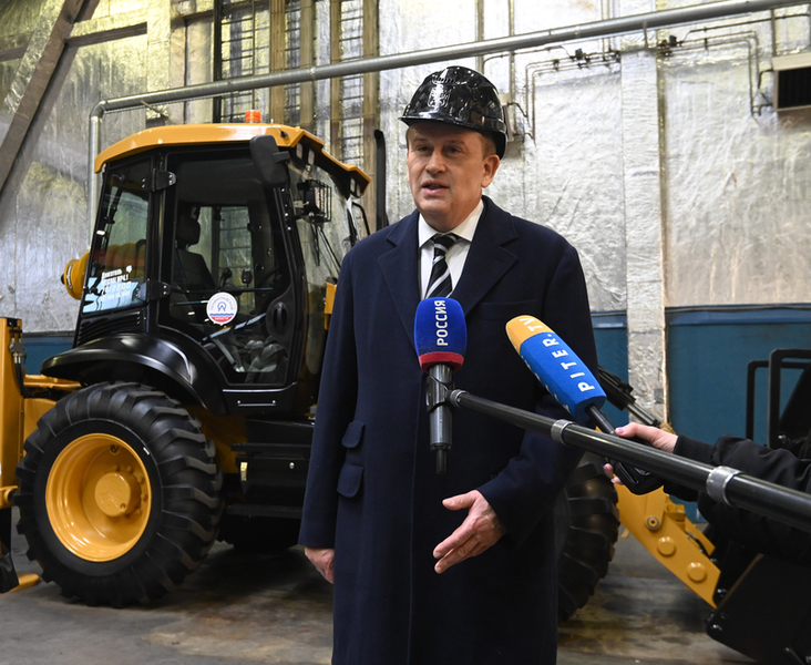 Губернатор осмотрел цеха завода «Тосно», который простаивал после ухода иностранного инвестора в 2022 году: сварочный и сборочный, где ему показали конвейер, готовые экскаватор-погрузчик, бульдозер, коммунальную машину и особенно новый пилотный экскаватор-погрузчик.